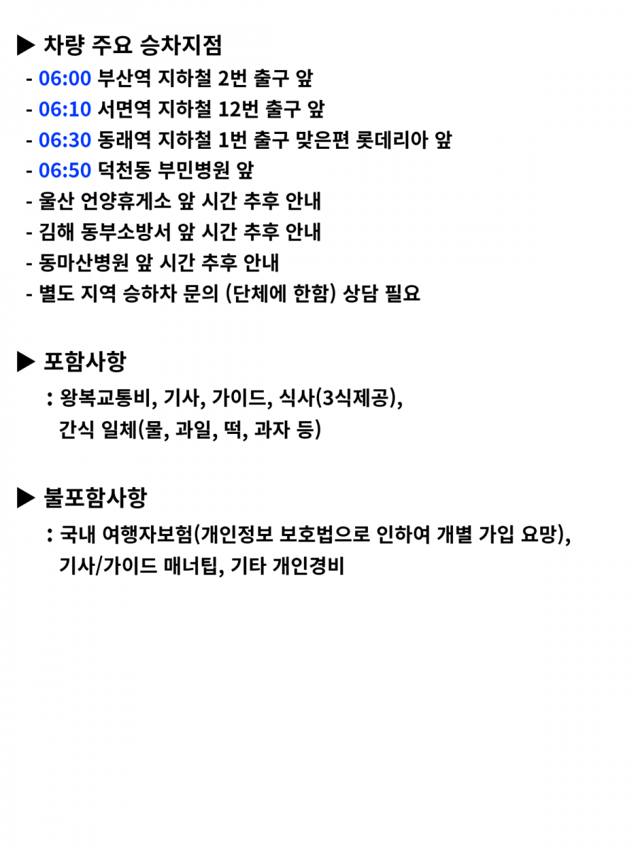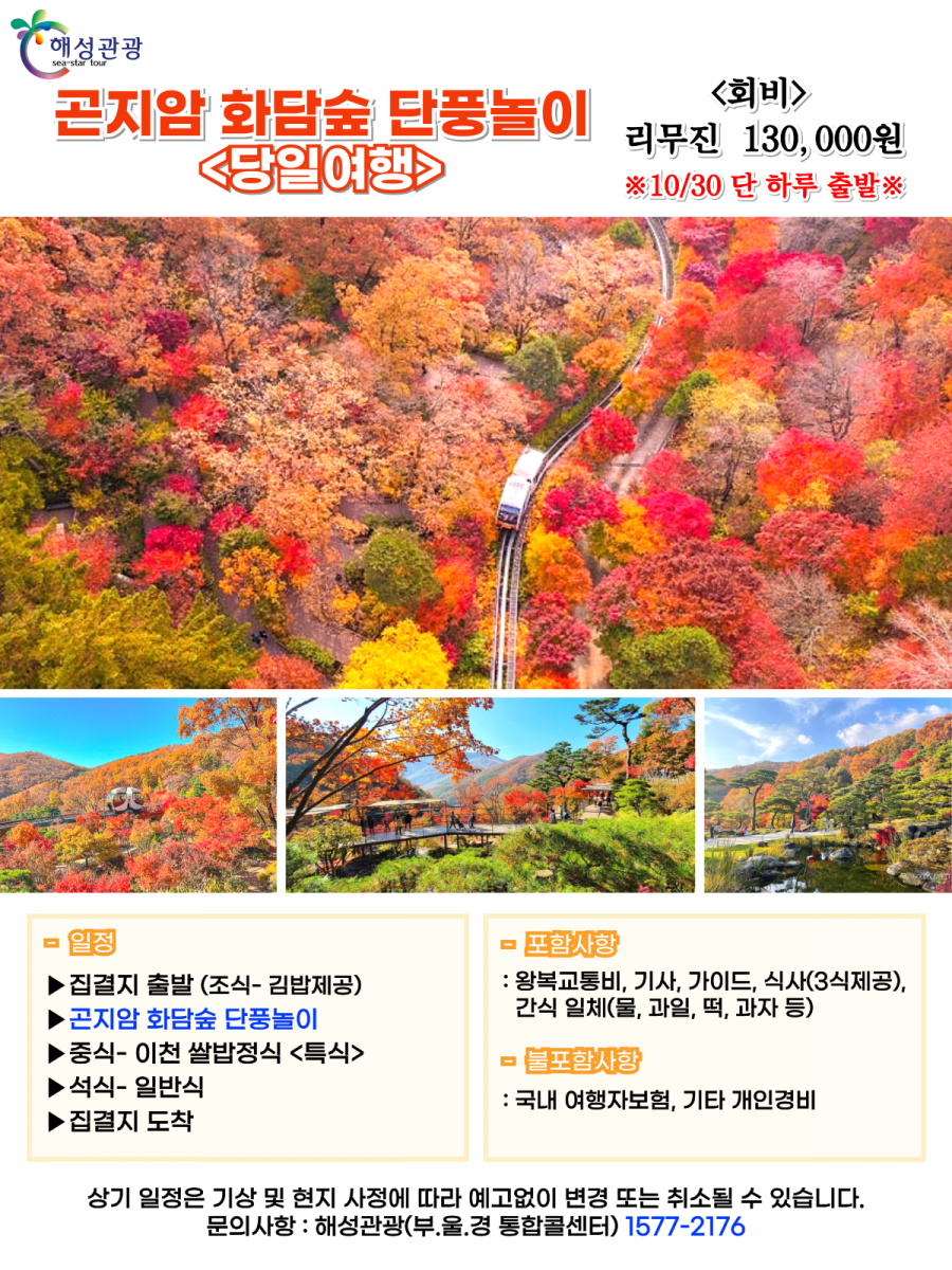 곤지암 화담숲 단풍놀이 당일 우리나라 최대 화목원, 예약하기가 아주 어려운 관광지로 단풍놀이의 진수를 보여 줍니다 공유하기 여행지역 경기도 광주시 포함사항 왕복교통비, 3식(김밥포함), 간식, 입장료 불포함사항 국내 여행자보험, 기타 개인경비, 매너팁 여행일정 출발일 10월30일 단하루!!!! 인원 27 금액 130,000 원 설명