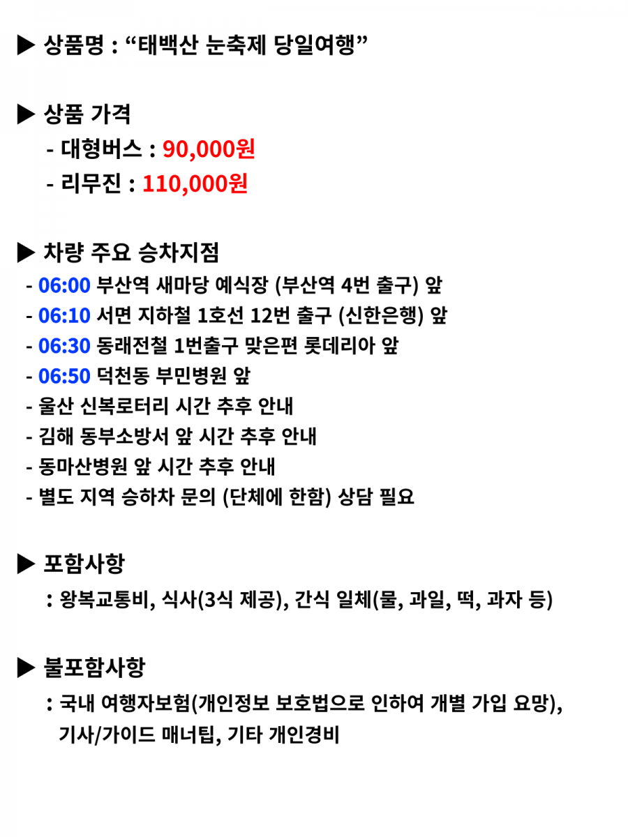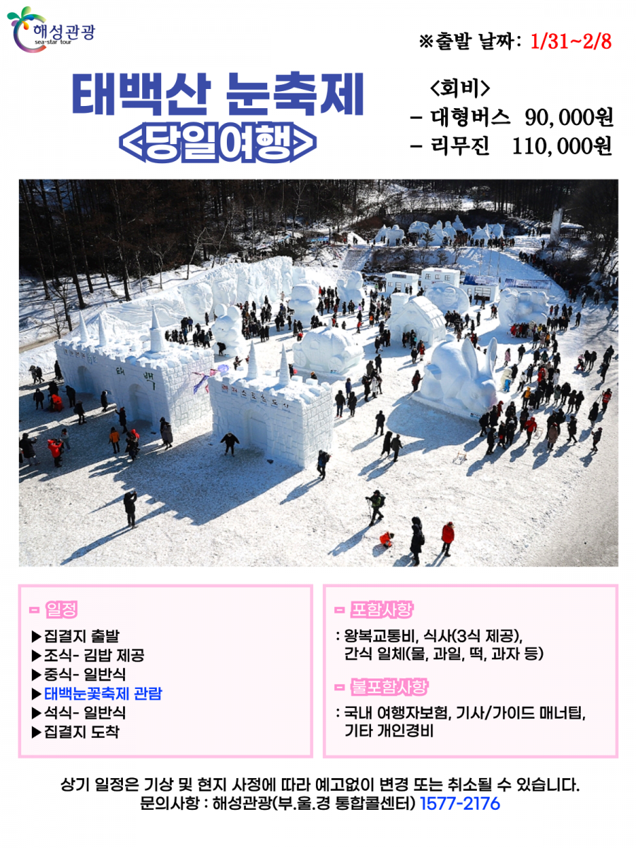 태백산 눈축제 당일 부산에서 보기 힘든 하얀 설원위에 펼쳐진 눈세상과 여러가지 눈조각, 눈체험을 즐겨보세요~ 공유하기 여행지역 강원도 태백시 일원 포함사항 왕복교통비, 3식, 간식 불포함사항 여행자보험, 개인 경비 여행일정 출발일 1월31일~2월8일 까지 인원 45 금액 90000 원 설명