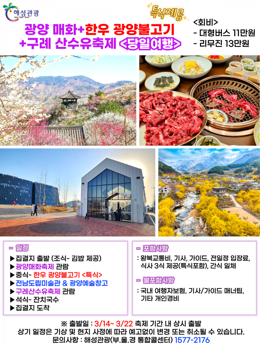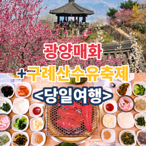 광양매화+구례산수유축제 당일여행 당일 열차 타고 떠나는 광양 매화·구례 산수유 봄꽃 여행!! 공유하기 여행지역 전라남도 광양, 구례 포함사항 전용버스, 3식(특식포함), 간식, 가이드 및 입장료 불포함사항 국내 여행자보험, 기사/가이드 매너팁, 기타 개인 경비 여행일정 출발일 3/14~3/22 축제 기간 내 상시 출발 인원 40 금액 110,000 원 설명