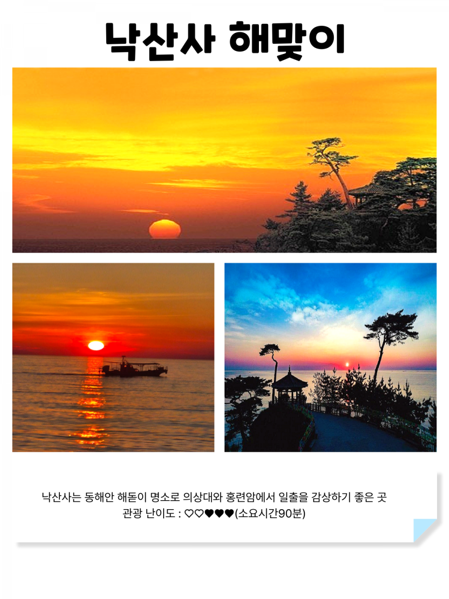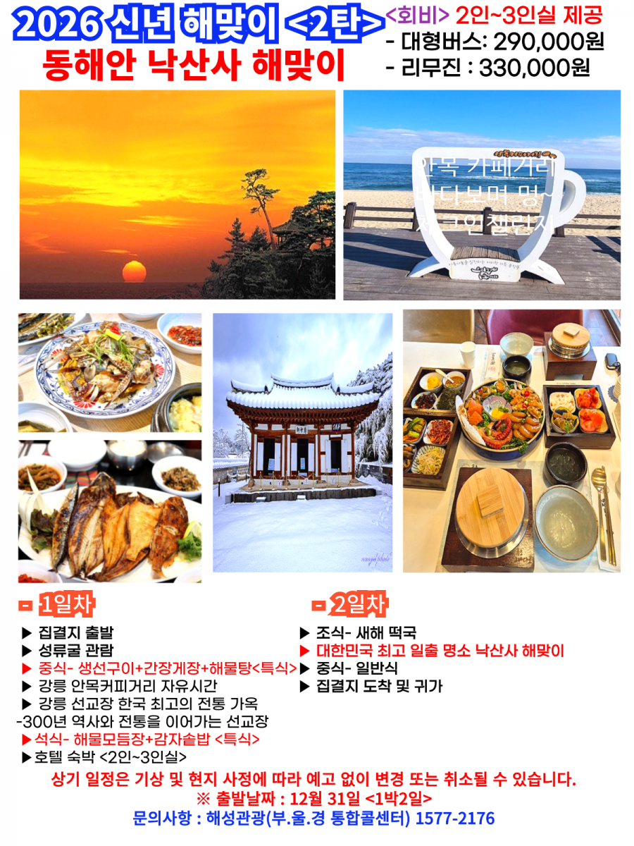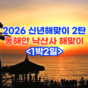 2026 동해안 낙산사 해맞이 1박2일 해맞이 1등 명소! 낙산사에서 일출의 기운을 느껴 보세요~ 공유하기 여행지역 강원도 일대 포함사항 왕복 교통비, 숙박비(2~3인실기준), 전일정 입장료, 식사(1박4식), 간식 불포함사항 국내 여행자보험, 기사/가이드 매너팁, 싱글차지, 기타경비 여행일정 출발일 12월31일 단 하루 출발! 인원 45 금액 290,000 원 설명