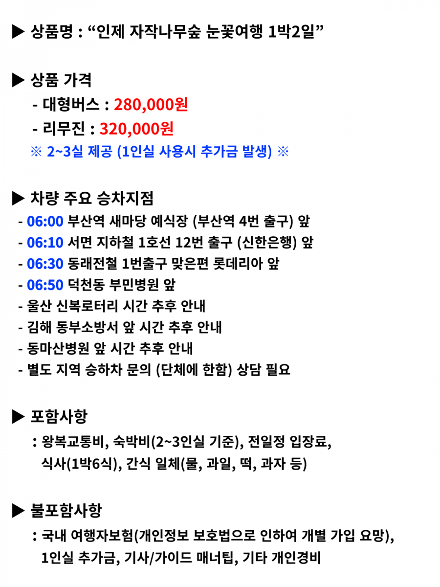 인제 자작나무숲 눈꽃여행 1박2일 겨울하면 으뜸으로 손꼽히는 쭉쭉 뻗은 자작나무와 소금을 뿌려놓은듯 햐얀 눈꽃세상을 만나보세요~ 공유하기 여행지역 강원도 일대 포함사항 왕복 교통비, 숙박비(2~3인실 기준), 전일정 입장료, 식사(1박6식), 간식 불포함사항 국내 여행자보험, 기사/가이드 매너팁, 싱글차지, 기타경비 여행일정 출발일 2026년 1월 13일 부터~ 인원 45 금액 280,000 원 설명