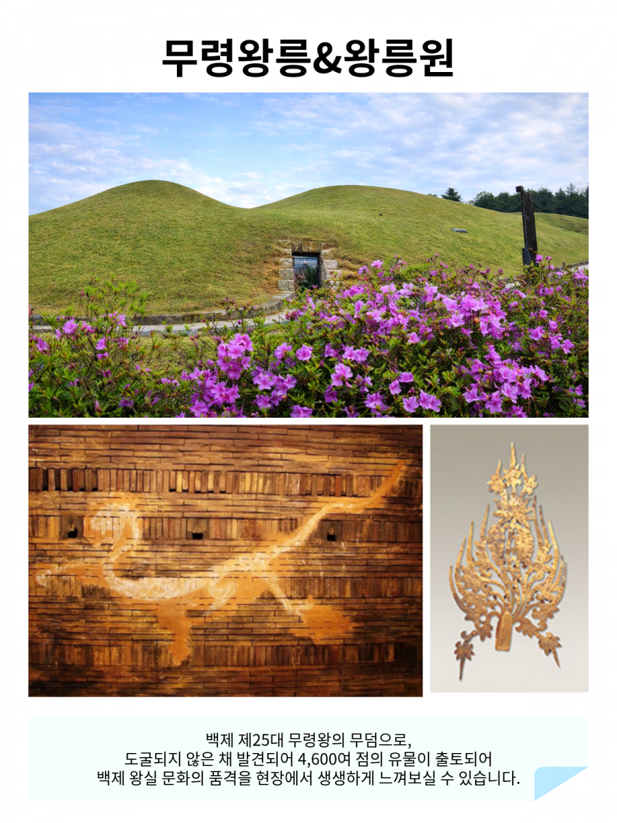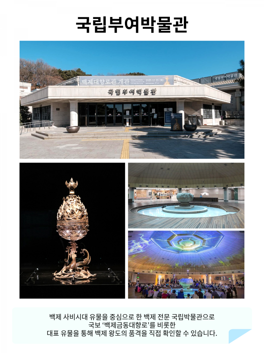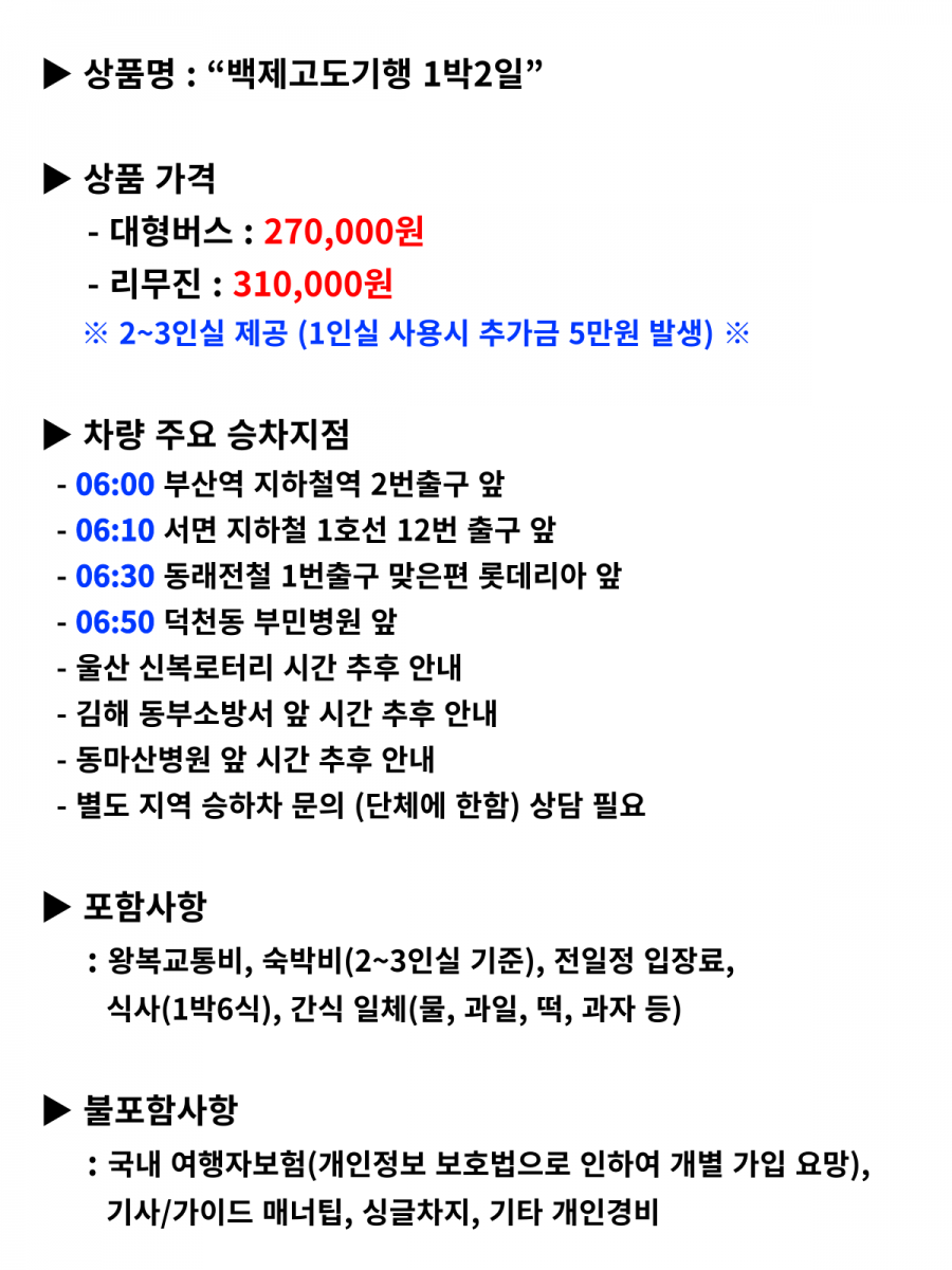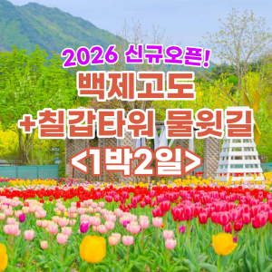 백제고도+칠갑타워 물윗길 1박2일 2026 신규 오픈한 청양의 칠갑타워 호수 물윗길+스카이워크 전망대와 함께 부여, 공주 일대 백제의 숨결을 느껴보세요~ 공유하기 여행지역 청양, 부여, 공주, 세종 일대 포함사항 왕복 교통비, 숙박비(2~3인실기준), 전일정 입장료, 식사(1박6식), 간식 불포함사항 국내 여행자보험, 기사/가이드 매너팁, 싱글차지, 기타경비 여행일정 출발일 매주 화요일, 목요일, 토요일 인원 45 금액 270,000 원 설명