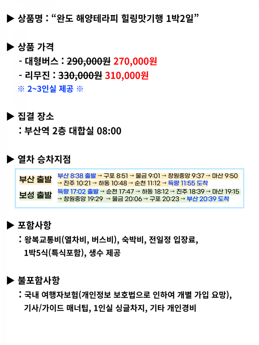 열차타고 떠나는 완도해양테라피 힐링맛기행 1박2일 2025 신규오픈! 완도해양치유센터에서 3시간 풀코스로 즐기는 치유테라피 (해수,머드,거품 테라피 등) 관광열차타고 떠나는 힐링 맛기행~ 공유하기 여행지역 전남 장흥, 완도, 보성 일대 포함사항 왕복 교통비(열차비,버스비), 숙박비(2~3인실기준), 전일정 입장료, 식사(1박5식), 생수 불포함사항 국내 여행자보험, 기사/가이드 매너팁, 싱글차지, 기타 개인경비, 간식 여행일정 출발일 4/4(토), 5/9(토), 6/20(토) 인원 45 금액 270,000 원 설명