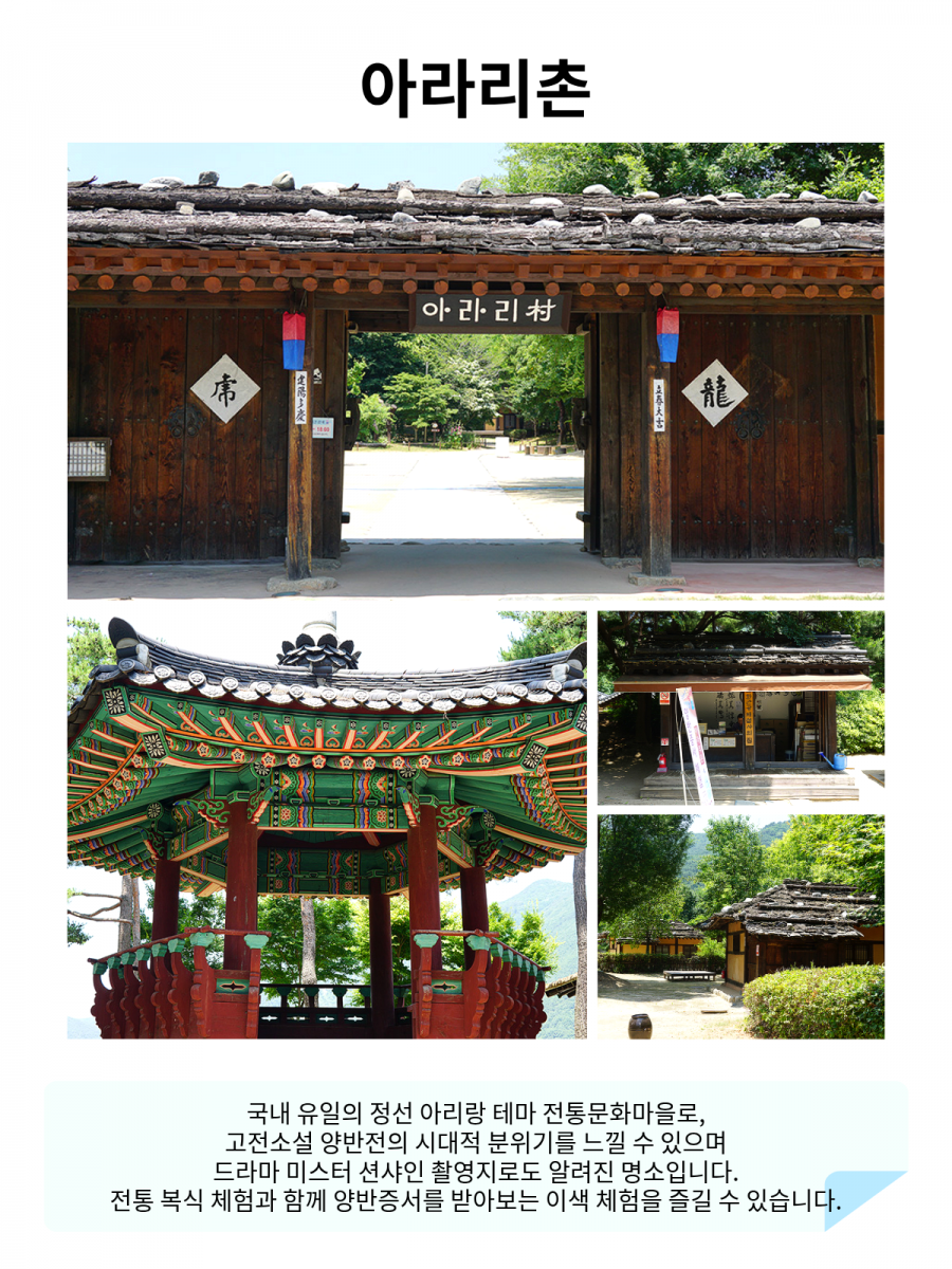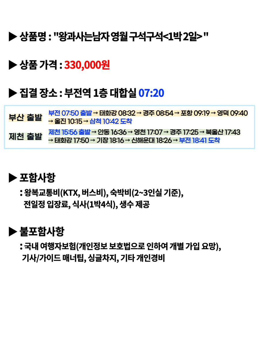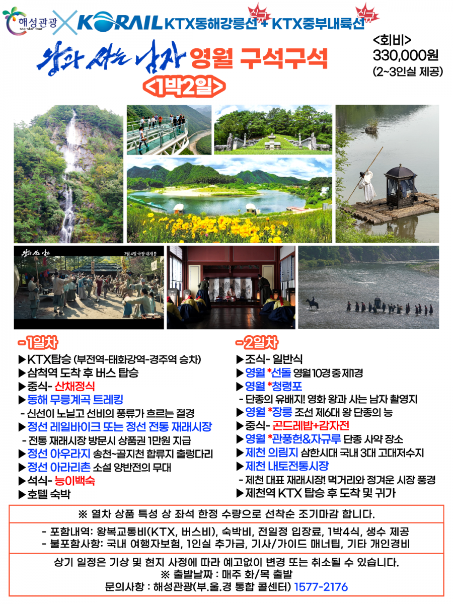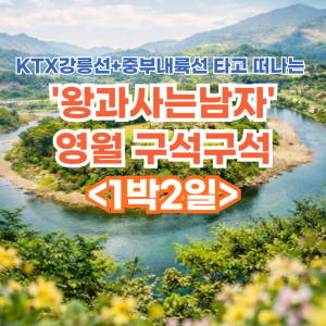 KTX타고 떠나는 '왕과사는남자' 영월 구석구석 1박 2일 영화 왕의 남자 촬영지와 동해 무릉계곡~정선 아라리촌까지! KTX 연계 상품으로 좌석 한정수량 선착순 마감입니다 공유하기 여행지역 강원도 동해, 정선, 영월 일대 포함사항 왕복교통비(KTX, 버스비), 숙박비, 전일정 입장료, 1박4식, 생수 제공 불포함사항 국내 여행자보험, 기사/가이드 매너팁, 싱글차지, 기타 개인경비, 간식 여행일정 출발일 매주 화요일, 목요일 인원 40 금액 330,000 원 설명