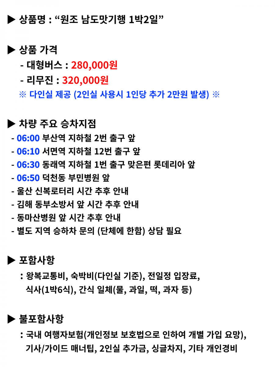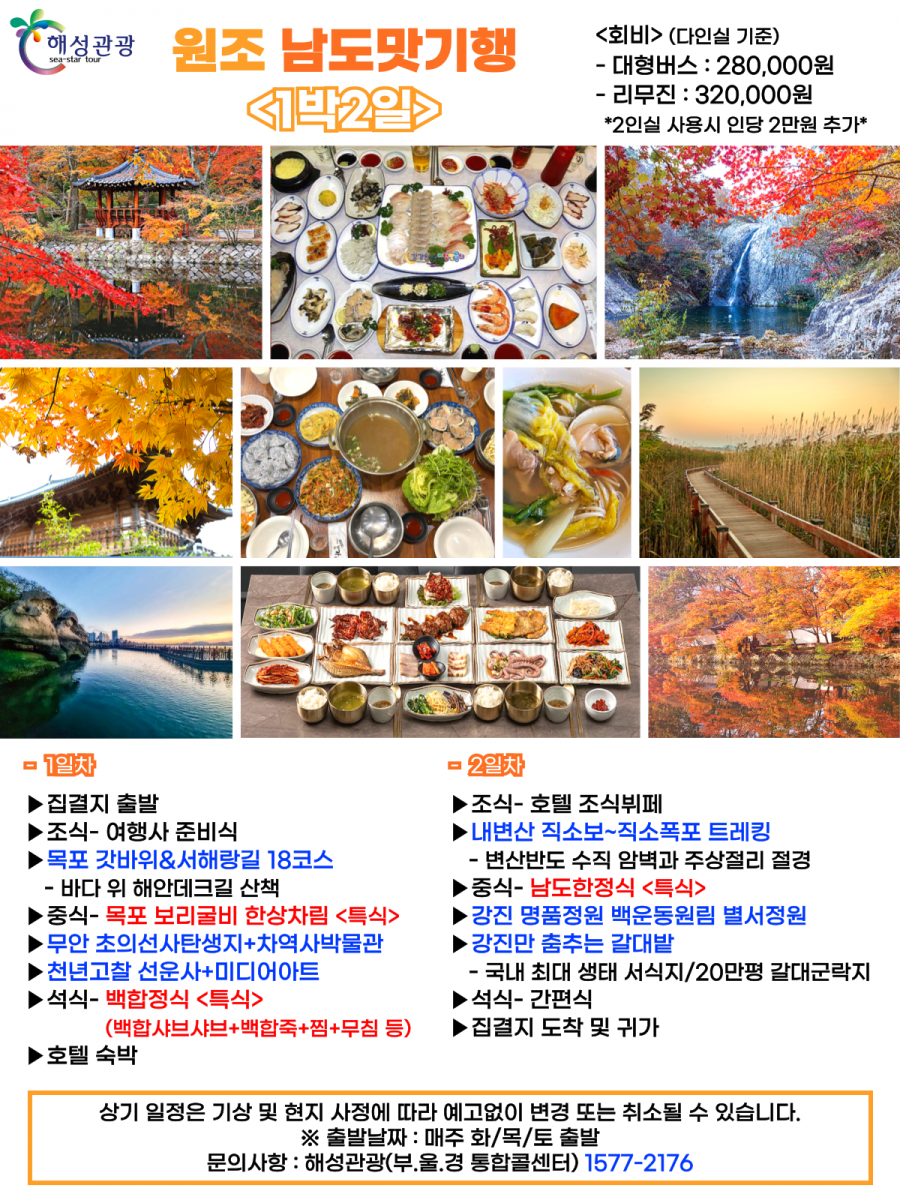원조 남도맛기행 1박2일 맛의 1번지 남도에서 멋진 단풍과 함께 미식 여행을 떠나보세요~ 공유하기 여행지역 전라 남.북도 일대 포함사항 왕복 교통비, 숙박비(다인실기준), 전일정 입장료, 식사(1박6식), 간식 불포함사항 국내 여행자보험, 기사/가이드 매너팁, 2인실 추가금, 싱글차지, 기타경비 여행일정 출발일 매주 화요일, 목요일, 토요일 인원 45 금액 280,000 원 설명