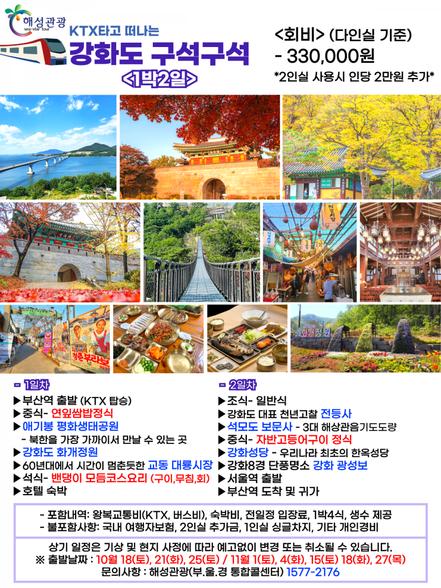 KTX타고 떠나는 강화도 구석구석 1박2일 1박2일 동안 강화도를 완전 정복하고 올 수 있는 KTX 연계 상품! 좌석 한정수량 선착순 마감입니다 공유하기 여행지역 강화도 일대 포함사항 왕복교통비(KTX, 버스비), 숙박비(다인실 기준), 전일정 입장료, 식사(1박4식), 생수 제공 불포함사항 국내 여행자보험, 기사/가이드 매너팁, 2인실 추가금, 싱글차지, 기타 개인경비, 간식 여행일정 출발일 10월 18(토), 21(화), 25(토) / 11월 1(토), 4(화), 15(토) 18(화), 27(목) 인원 40 금액 330,000 원 설명