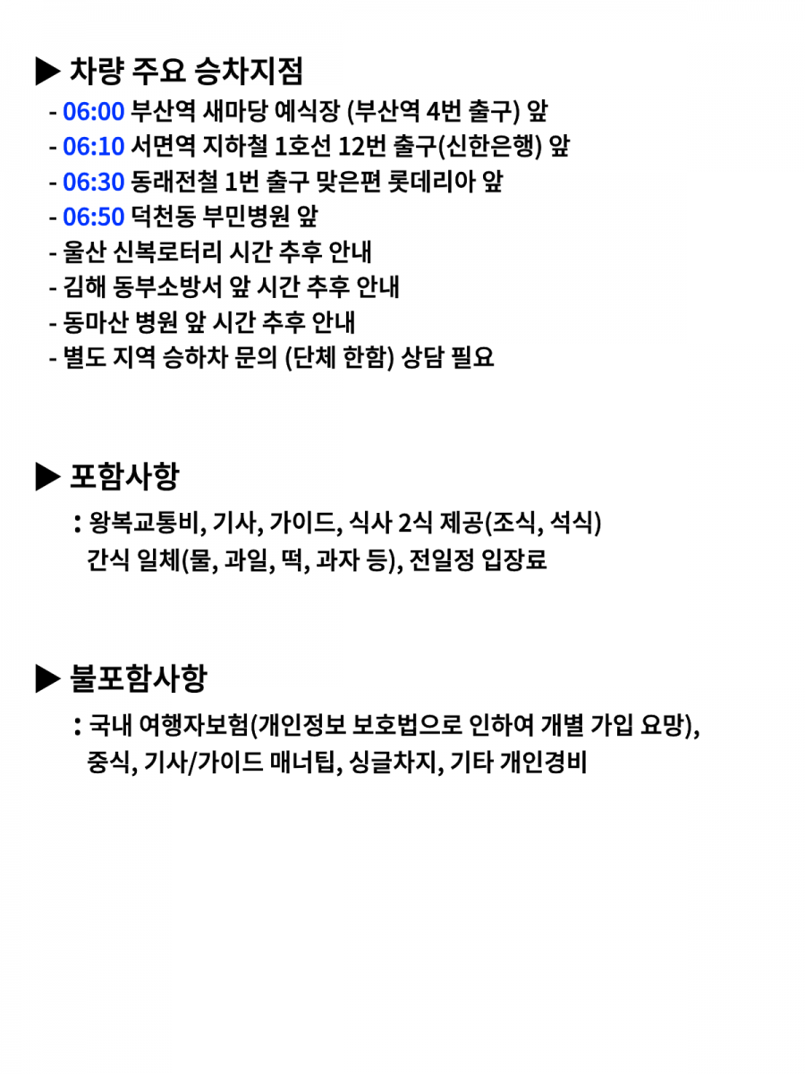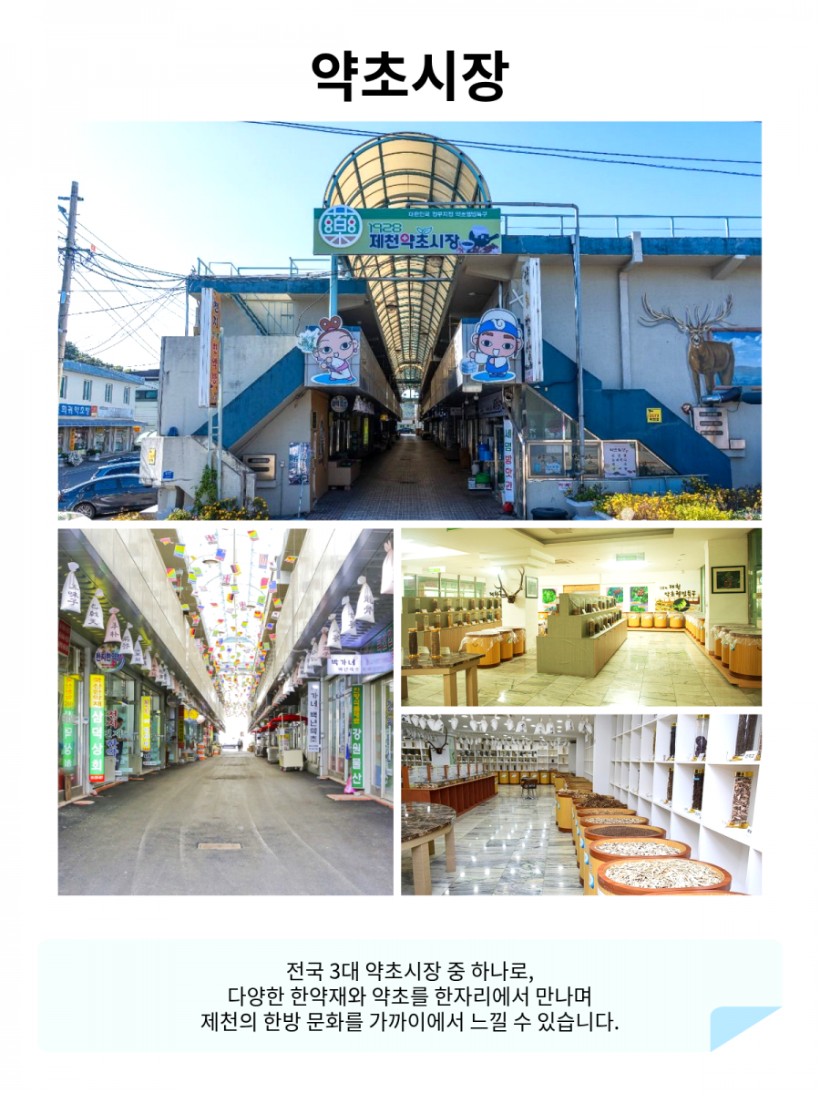 제천 구석구석&전통시장투어 당일여행 당일 제천 의림지, 모산비행장 유채꽃밭(BTS 뮤비촬영지), 내토시장, 한방엑스포공원, 약초시장 등 제천 구석구석을 하루만에 완벽정복! 공유하기 여행지역 제천 일대 포함사항 전용버스, 기사, 가이드, 조식 김밥 제공, 간식 일체, 전일정 입장료, 불포함사항 국내 여행자보험, 기사/가이드 매너팁, 중식, 기타 개인경비 여행일정 출발일 매주 화, 목, 토, 일 인원 40 금액 80,000 원 설명
