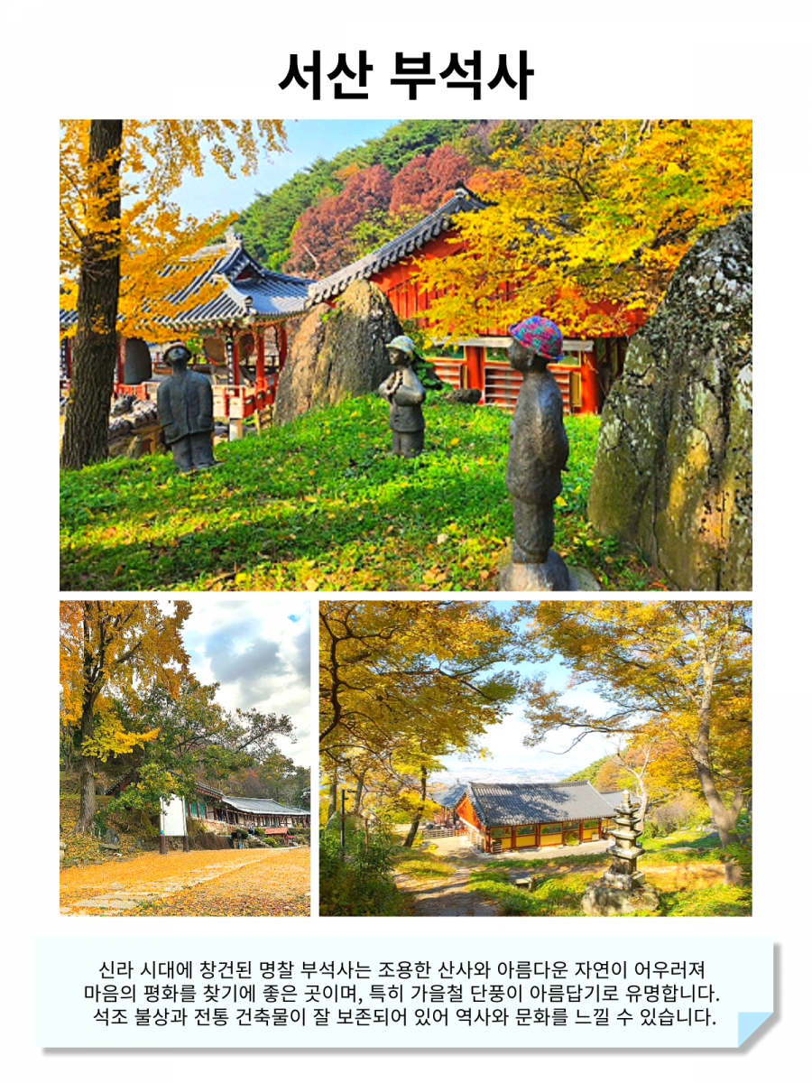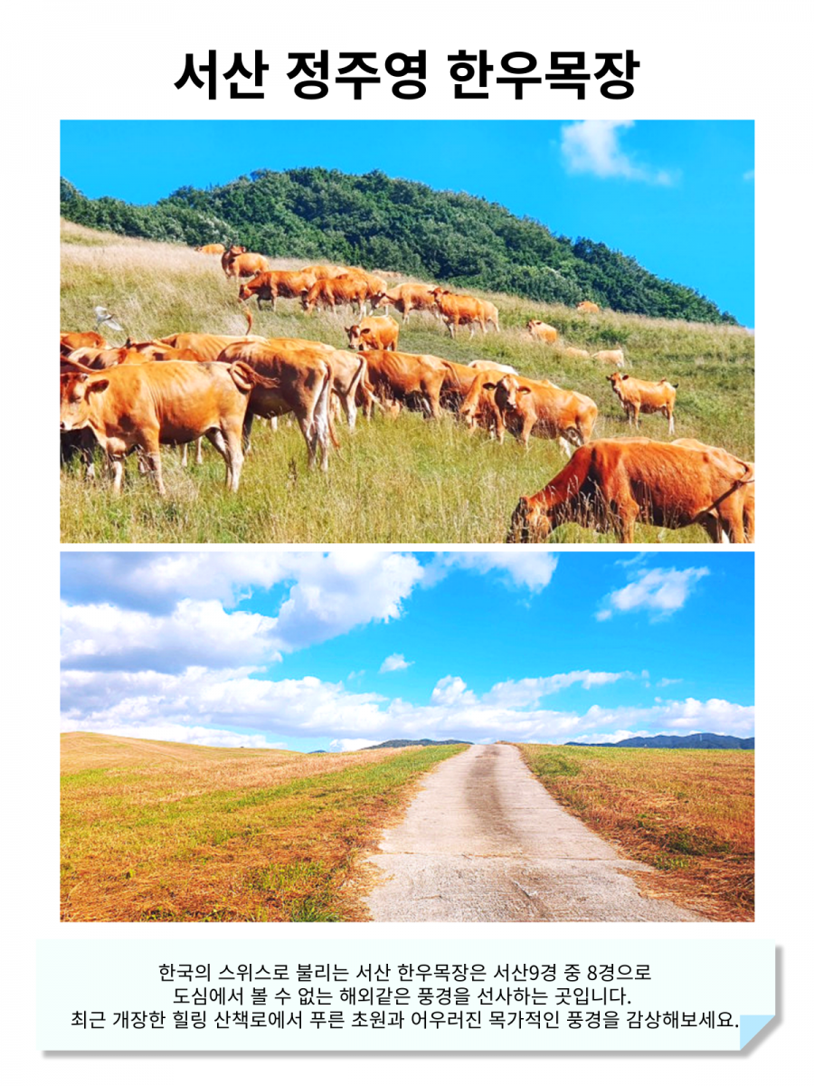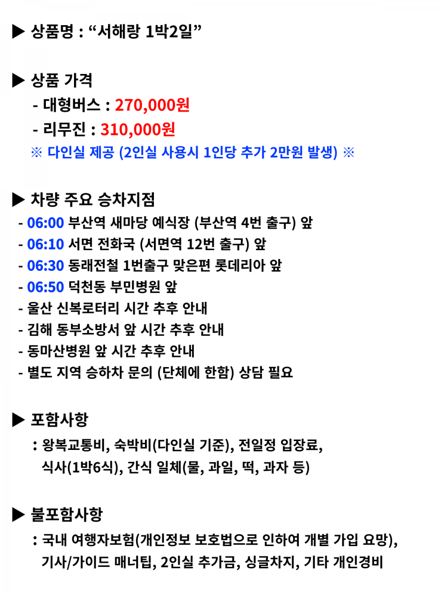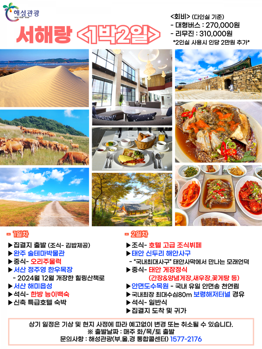 서해랑 1박2일 국내 유일 사막지대와 단풍의 절묘한 만남! 충청도 일대 서산, 태안, 안면도의 가을을 만나보세요 공유하기 여행지역 완주, 서산, 태안 일대 포함사항 왕복 교통비, 숙박비(다인실기준), 전일정 입장료, 식사(1박6식), 간식 불포함사항 국내 여행자보험, 기사/가이드 매너팁, 2인실 추가금, 싱글차지, 기타경비 여행일정 출발일 매주 화요일, 목요일, 토요일 인원 45 금액 270,000 원 설명