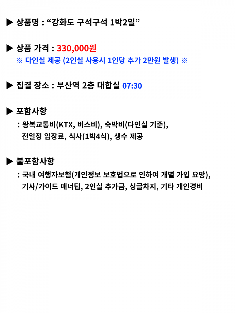 불포함사항 국내 여행자보험, 기사/가이드 매너팁, 2인실 추가금, 싱글차지, 기타 개인경비, 간식